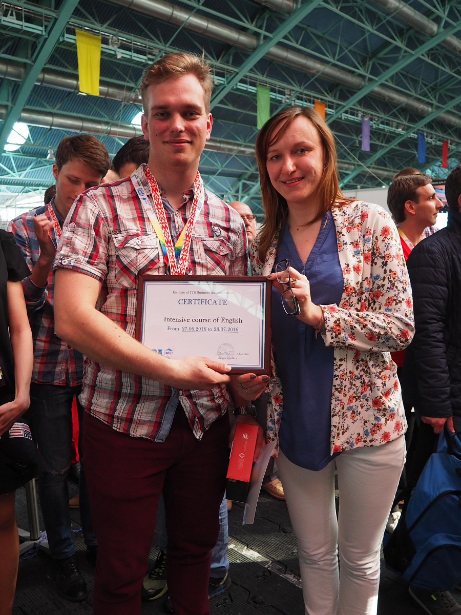 Победитель соревнований в компетенции «Сетевое администрирование», Лукашик Павел, получил сертификат на бесплатное обучение на летнем интенсивном курсе английского языка от Института ИТ и бизнес-администрирования.